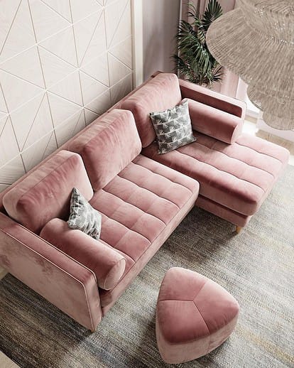 Inspirado en un estilo glamuroso, este sofá se presenta en un sofisticado terciopelo palo rosa en la imagen, pero es totalmente personalizable para adaptarse a tu gusto. La comodidad está asegurada gracias a sus cojines mullidos que invitan al descanso.